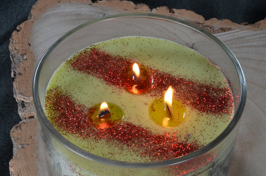 Designkaars in glas met 3 houten Pitten, Metallic Rood afgewerkt - 13x13 cm Hoogte: 8 cm