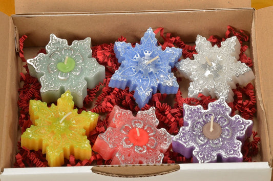 Geschenkdoos met 6 grote STER KAARSEN (B) in 6 kleuren