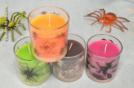 4 verschillende HALLOWEEN kaarsen in glas (nep spin gratis)