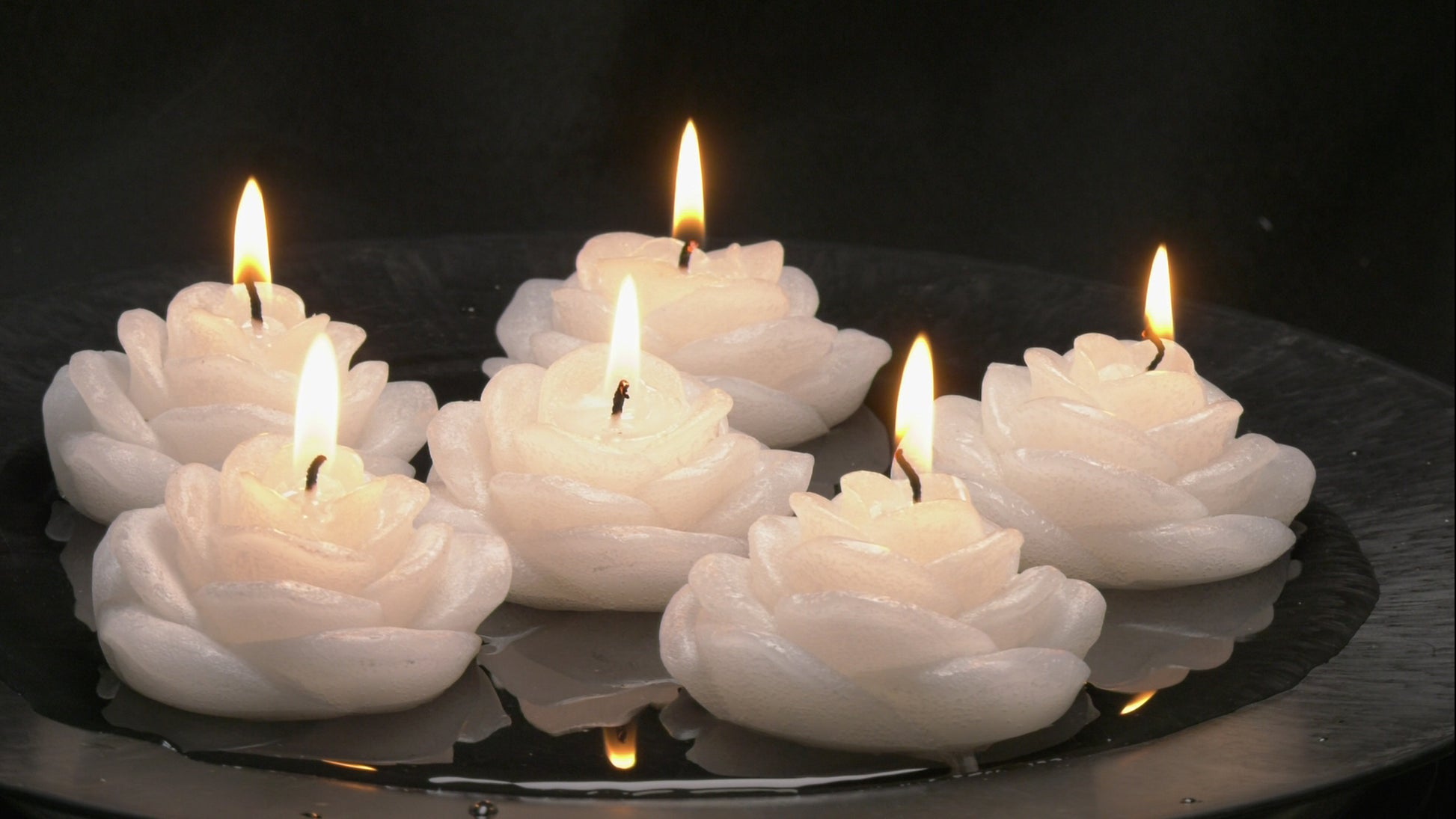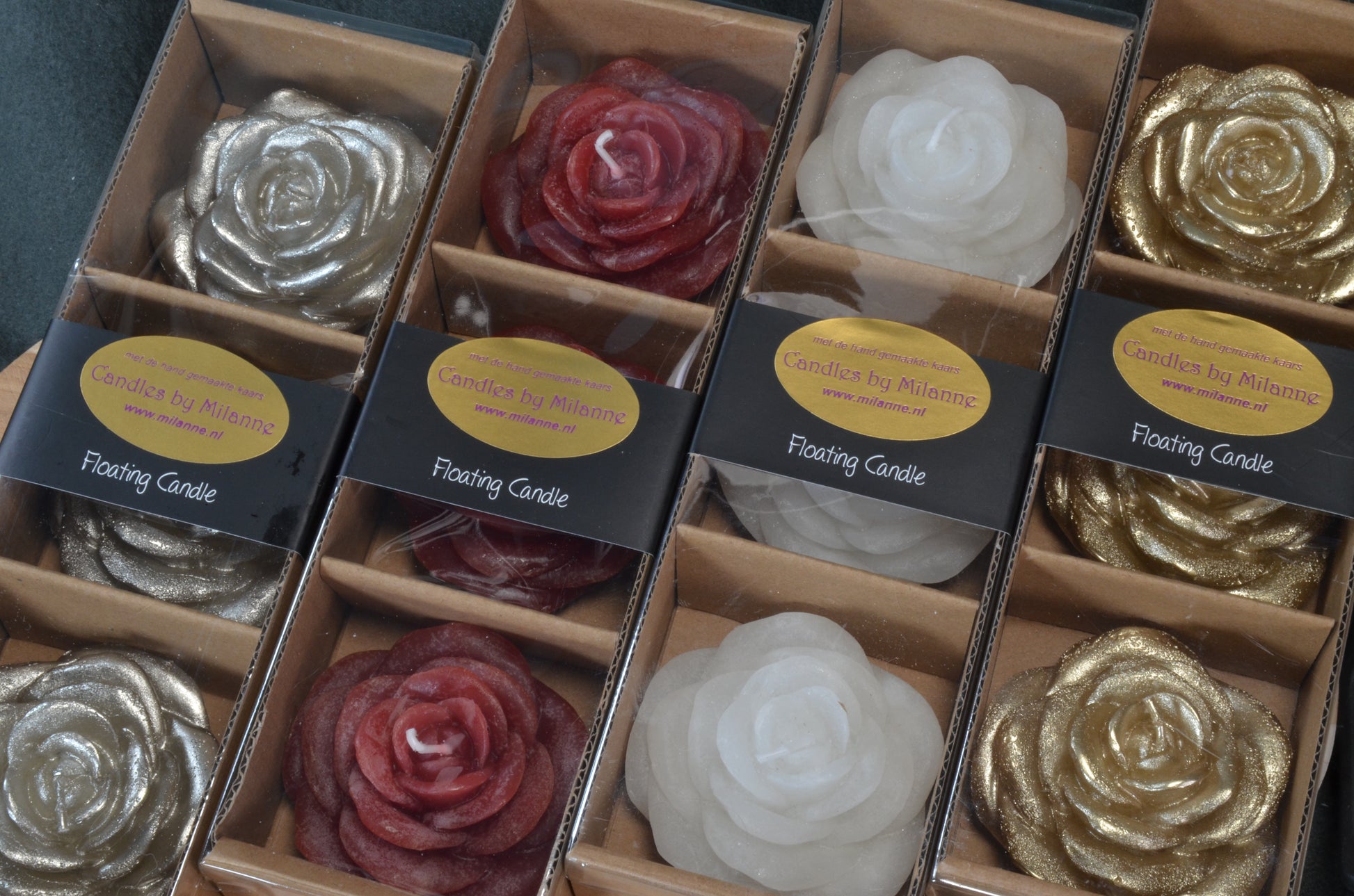 Geschenkdoos met 3 supergrote DRIJFKAARSEN in de vorm van een Bloem.