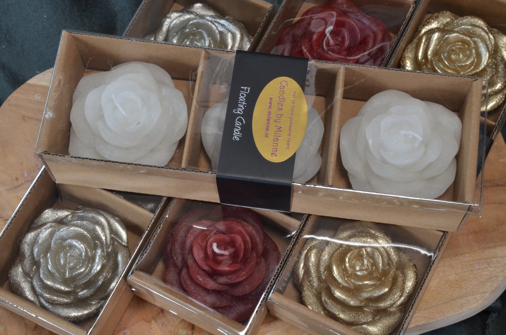 Geschenkdoos met 3 supergrote DRIJFKAARSEN in de vorm van een Bloem.