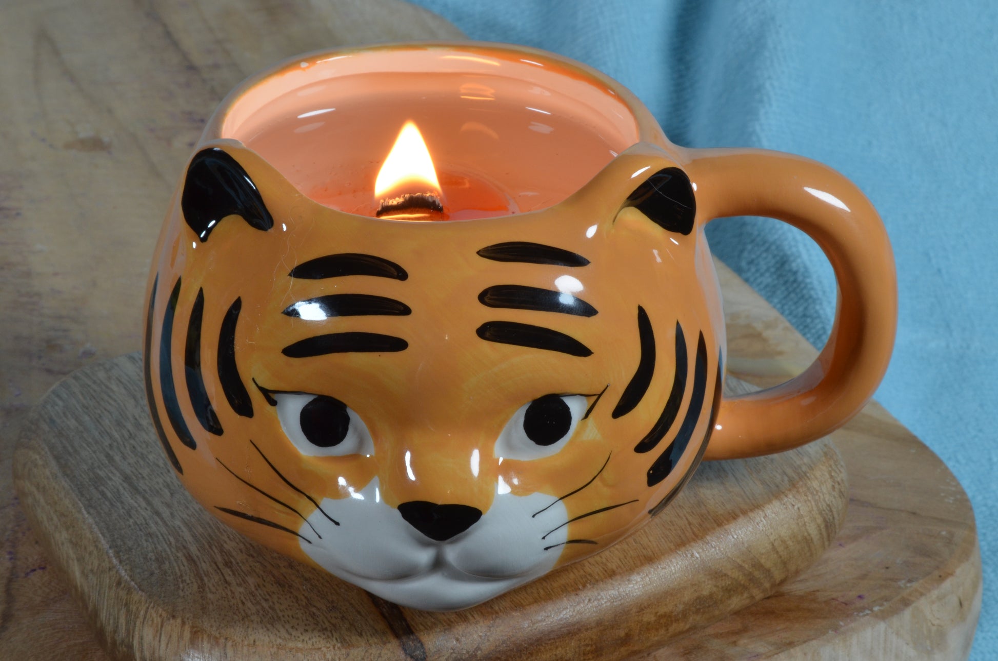 Nieuw voor 2025 :Prachtige gelkaars met houten Pit. Gegoten in een beker met 3d Tijger in keramiek..