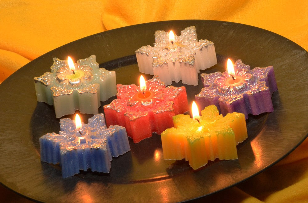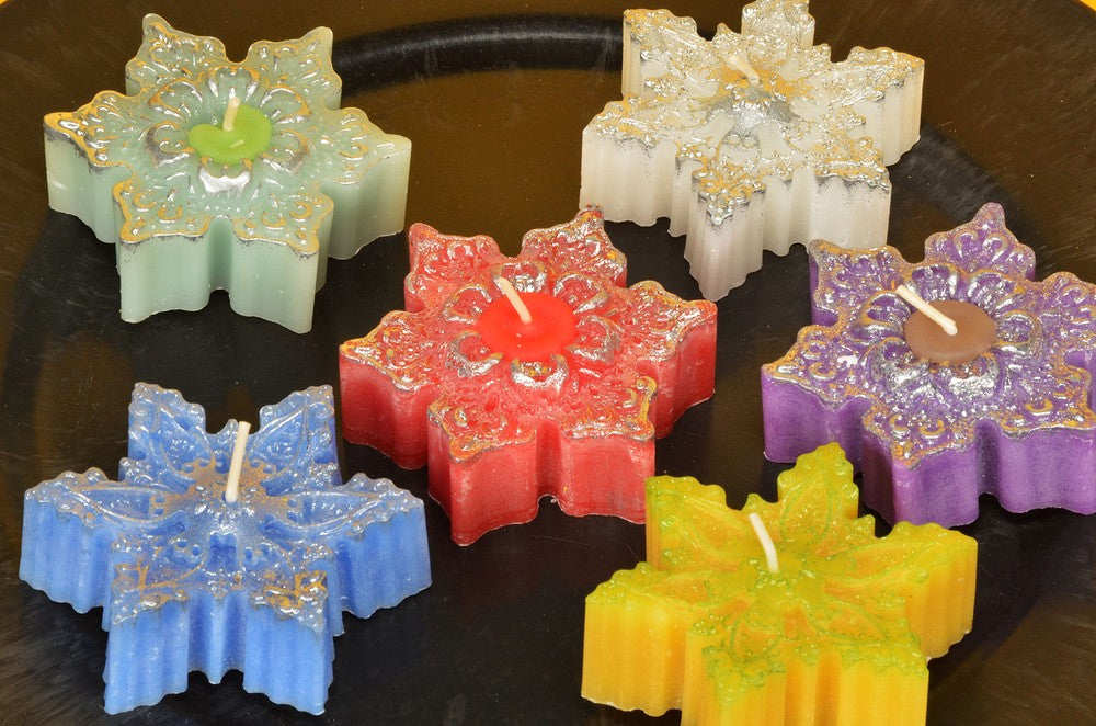 Geschenkdoos met 6 verschillende sterkaarsen. 7,5x7,5 cm