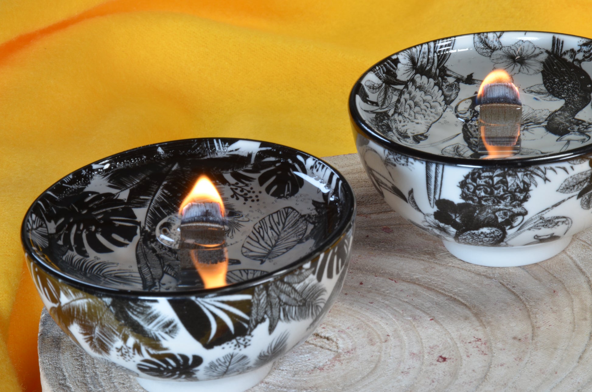 Doordat we transparante gelwas hebben gebruikt, komt de zwart-wit pentekening in de schaal, ook als de kaars aan is, volledig tot zijn recht.