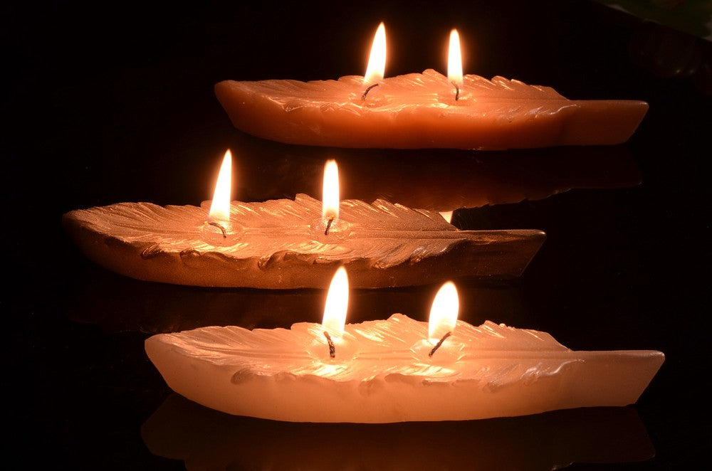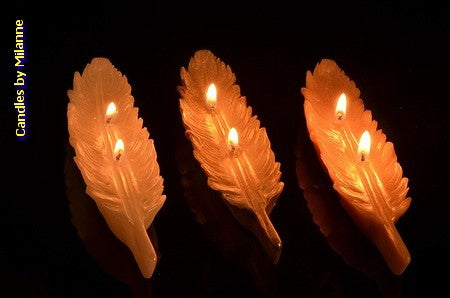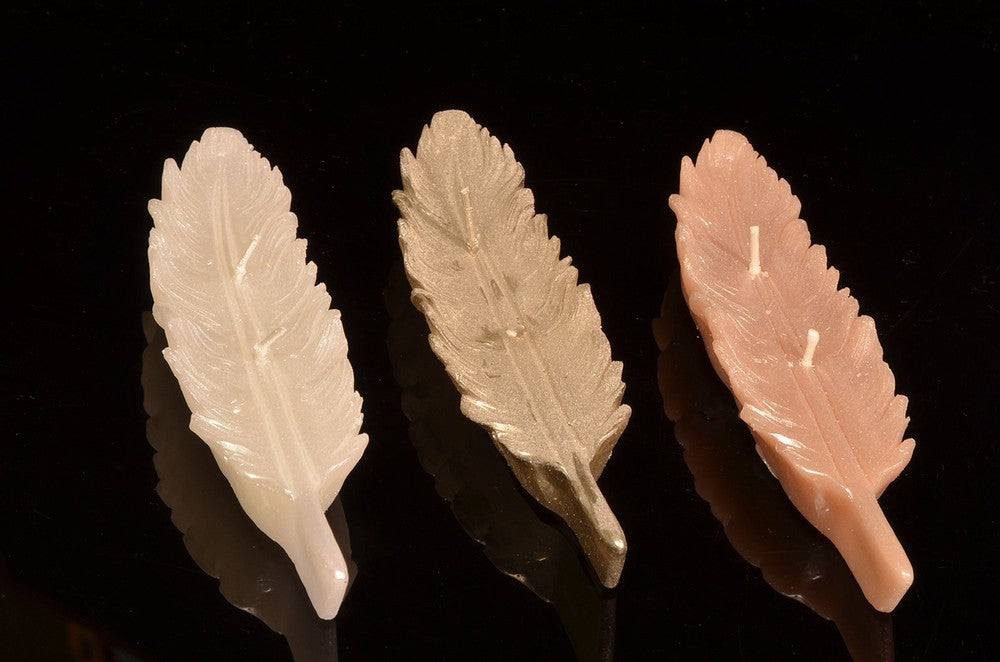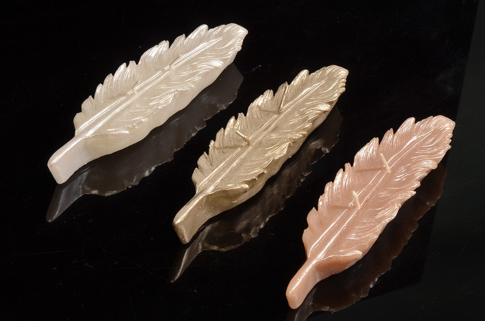 3 verschillende designkaarsen in de vorm van een veer. Iedere kaars heeft 2 pitten. 1x zilver metallic, 1x wit metallic en 1x roze champagne metallic. 16x2x3 cm Iedere kaars is apart verpakt in luxe geschenkdoos. Geheel m...Meer info