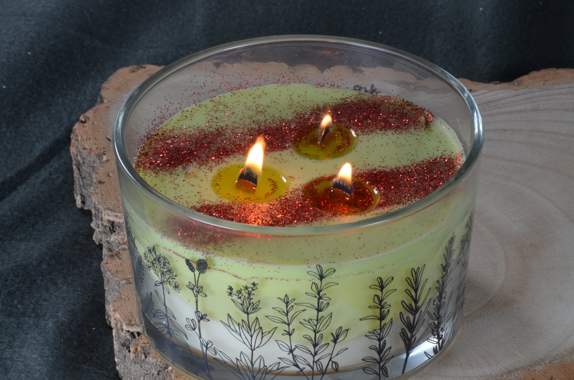 Wonderschone XXL Kaars met 3 houten Pitten (Wooden Wick) Hij heeft een doorsnede van 13 cm en een hoogte van 9 cm. Zacht geel in de basis en met rode metallic glitter afgewerkt.